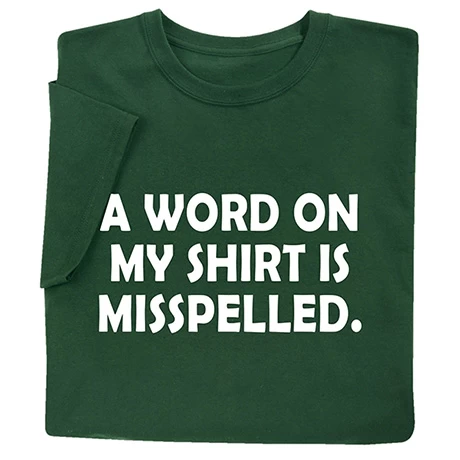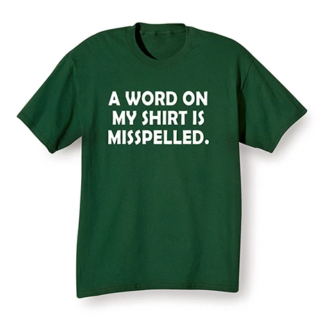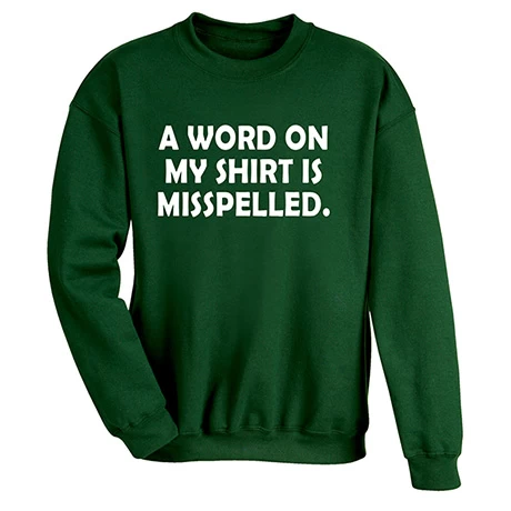 You’ll get the last laugh when you say âGottcha!â to the puzzled folks who actually pause to try to find the error. Dark Green sweatshirt is 50/50 cotton blend, T-shirt is preshrunk 100% cotton. Machine wash. Imported. S-3XL.