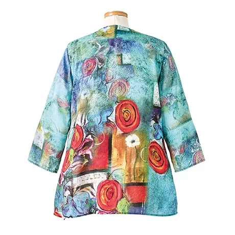 Pretty, abstract poppies decorate this lightweight, open-front poly chiffon jacket. It’s got a beautiful drape that moves with the wearer and a colorful pattern that comes into focus as it reaches the hem. 3/4-sleeves. Hand wash. Imported. S(6-8), M(10-12), L(12-14), XL(14-16), 1X(18-20), 2X(20-22). M hangs 29″.