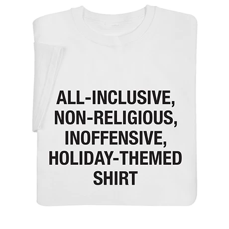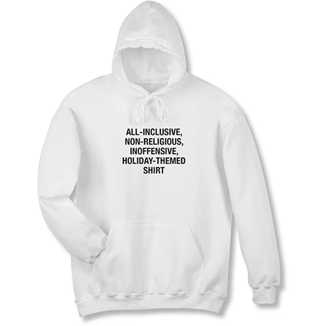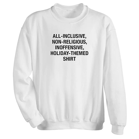 When you want to keep the peaceĀ during theĀ season’s festivities, this deliversĀ the perfect noncommittal holiday message. White sweatshirts are 50/50 cotton blend, T-shirt is preshrunk 100% cotton. Machine wash. Imported. S-3XL.