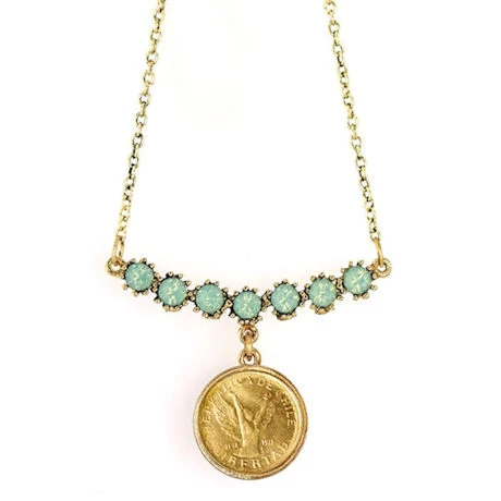 Blue crystals sparkle above a Chile Angel Libertad coin making this swag style necklace heavenly. The Chile Libertad is a 5 peso coin composed of nickel brass and displays an angel raising her arms upwards. The angel coin hangs on a 21 inch antiqued goldtone chain with a lobster claw clasp. A Certificate of Authenticity is included. Allow 2-3 weeks for delivery. No rush delivery or gift box.