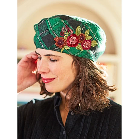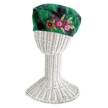 A flattering capĀ in classic tartan plaids gets a feminine flourish with beautifully detailed embroidery. Made of a wool/acrylic/polyester blend fabric in rich colors, the beretĀ isn’t just stylish. It’sĀ fully lined in polyester making itĀ comfortable to wear and has an elastic section on the back that provides anĀ adjustable fit and assurance it will stay in place. A great look with a great fit. 4″Ā x 9″. Dry clean. Specify Red, Green or Gray.