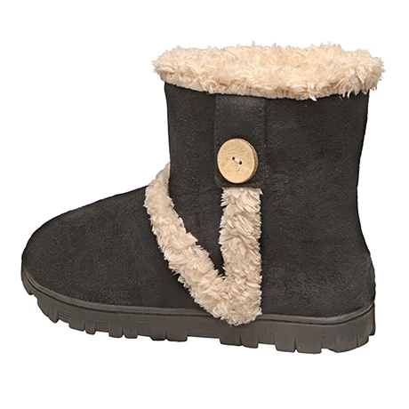 Step into comfort with the Ember Slipper Boot. Keep your tootsies pampered in these pull-on booties, perfect for chilly mornings or relaxing evenings. The upper exterior is a smooth microfiber with a suede-like texture. It is accented on the sides, across the vamp and around the top by trendy white faux fur trim and a charming wooden button. Luxuriously soft, fleecy insole is a plush way to keep your feet and ankles warm, whether lounging around the house or puttering in the yard. The sturdy, synthetic rubber soles are textured for secure traction indoors and out. Wear them with confidence as you visit the mailbox or take the dog for a walk around the block. Perfect for cold fall or winter days and nights, the Ember slipper boot is offered in Black, Gray, Pecan (tan), Navy Blue and Burgundy. Size Small, Medium, Large and XL.