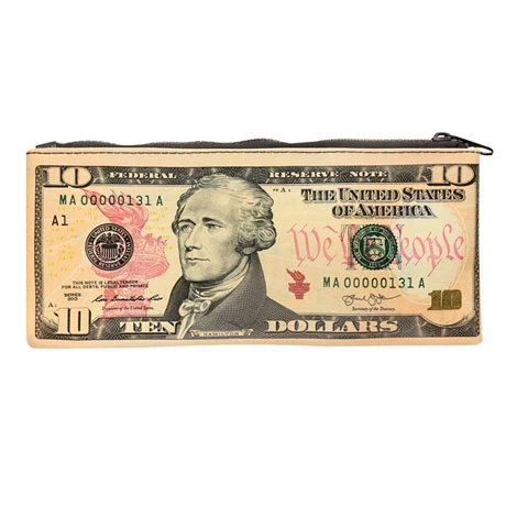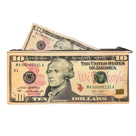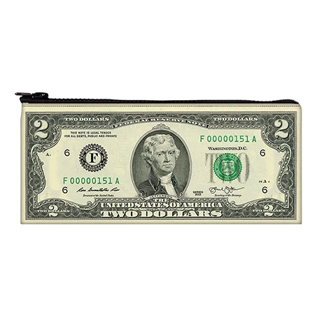 Stash your cash, cards, makeup, pens, the little notebook you carry everywhere, and more in these handy pouches. Each is polyurethane printed with an oversized bill, finished with a zipper top. 9 ¼” x 4 ¼”. Specify $2, $10 or $100.