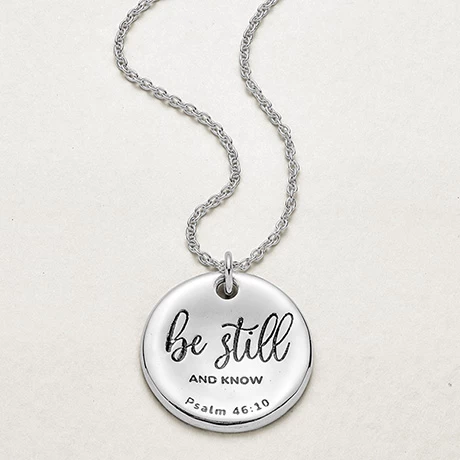 Thoughtfully designed with an indentation on the front, you can gently rub the pendant to evoke a sense of calm and ease anxiety. The sterling silver pendant is a beautiful reminder of Psalm 46:10, “Be still, and know that I am God; I will be exalted among the nations, I will be exalted in the earth. Sterling chain adjusts 16″-20″.