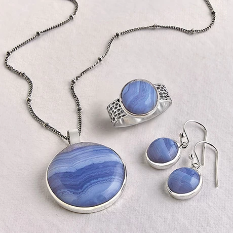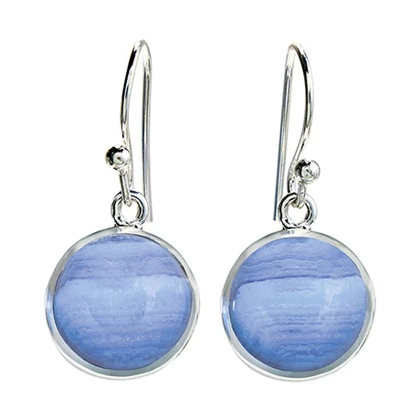 The agates’ striking banding of blue and white exudes a sense of cool and calm, and begs to be touched. But their beauty isn’t only on the surface: The gemstones are rich with ancient symbolism for healing, peace, and communicating with spirit guides. All of this is captured and contained in a sterling silver frame and hung from sterling earwires. 0.5″w. Hangs 1.5″H.