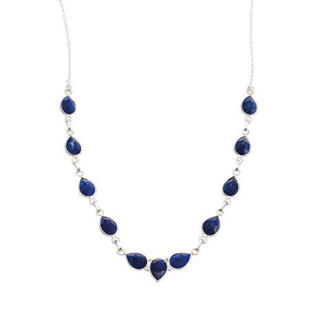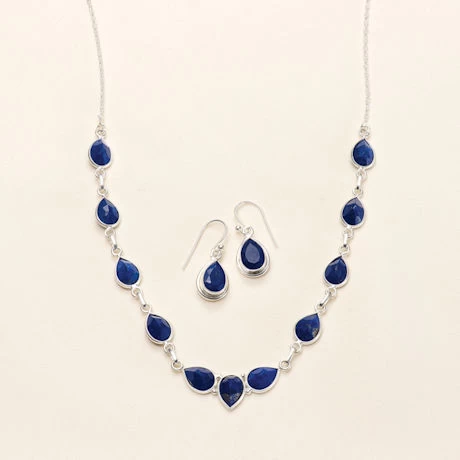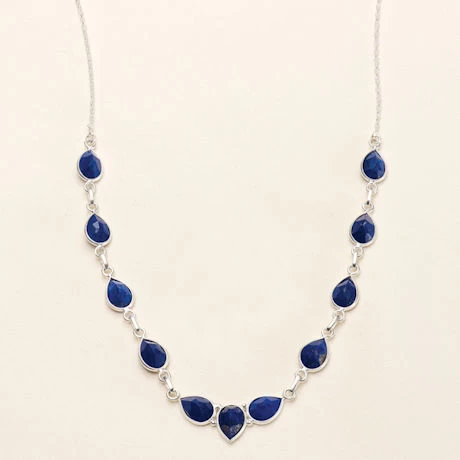 The ancient Egyptians wore teardrop-shaped gemstones, and they loved lapis. A tradition reaching back thousands of years, polished and faceted lapis stones are hand-set in sterling silver bezels and artfully linked. Necklace adjusts 16″-18″ with lobsterclaw clasp.
