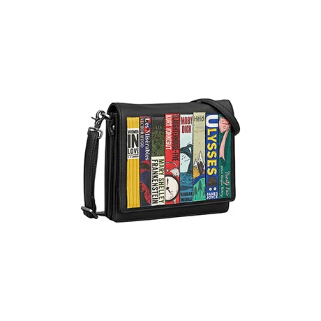 For the stylish bibliophile, flaunt your love of classic books. The pebbled vegan leather bag features the bindings of some of the most well-known novels. The interior features three compartments, three card slots, one zip pocket and a magnetic-snap flap. Removable strap adjusts from 32”-58”. Imported. 8.5”W x 7.5”H x 2”D.