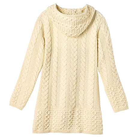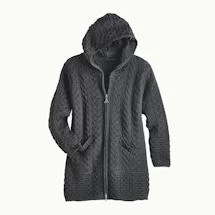 This cardigan has classic style with an urban attitude. The stitches are authentically Aran; the 3/4-length, two-way zipper, oversized hood and slanted front pockets are contemporary touches. The zipper pull is a Celtic knot. Makes a fashionable gift for women who love Irish style. Pure Merino wool. Hand wash. Made in the village of Monasterevin, County Kildare, Ireland. S(4-6), M(8-10), L(12-14), XL(16), XXL(18). Size M hangs 30″.