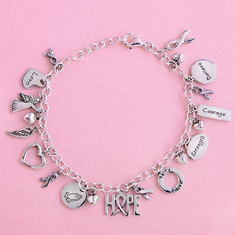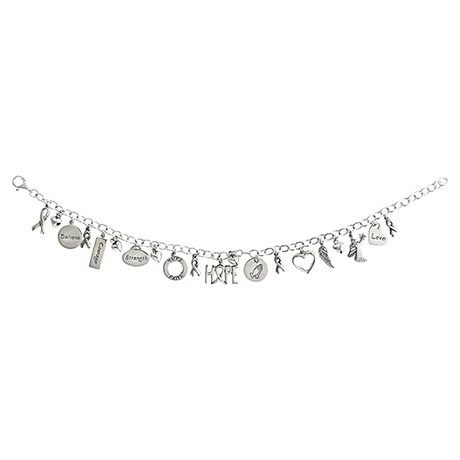 An enduring gift of support for a special someone who is fighting cancer. Made of sterling silver, the bracelet features 20 beautifully expressive charms of encouragement. They include ribbons, hearts, praying hands, an angel, a wing, and messages such as “Love,” “Believe,” “Courage,” “Strength,” and “Faith.” Adjusts 7¼”-8¼”. Lobster clasp.