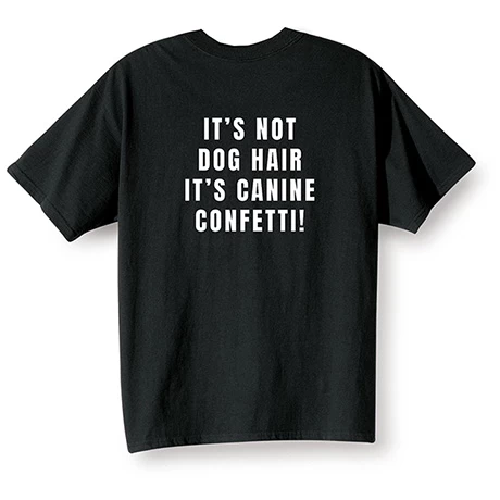 “It’s not dog hair it’s canine confetti.” It’s all about how you choose to see the world. Or in this case, the hair on your sofa. And your chair. And your bed. And your clothes. Let’s party! Black sweatshirt is 50/50 cotton blend, T-shirt is preshrunk 100% cotton. Sizes S-3XL. Imported.