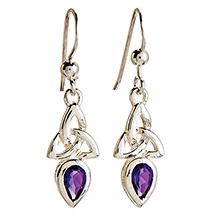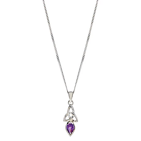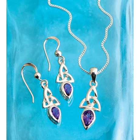 This necklace is the most simple, classic form of the Trinity Knot. It has no beginning, no end, and 3 points, representing the Trinity, as well as powerful forces like family and eternal love. This beautiful piece adds a teardrop shape to the classic knot and a rich purple amethyst within. The pendant is sterling silver. 1″H x .5″W; silver snake chain closes with a lobster claw clasp and adjusts 16″ā18″. Imported. Matching earrings available (#XG3086, sold separately).
