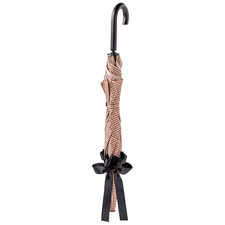 Domed and flared and accented with a satin ribbon, this hat-shaped umbrella adds style to rainy days. Woven raffia print, black wood handle. Manual open and close. 31″ high, 31″ across. Imported.