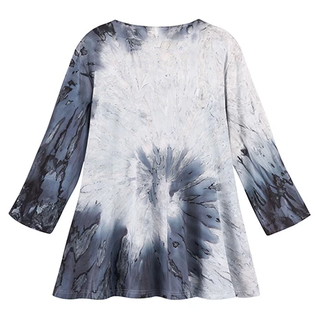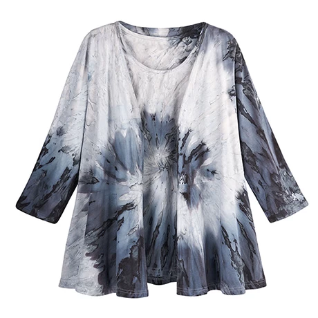 If you ever needed proof that bold hues aren’t always required to make a splash … These two pieces use just gray and white, but what an impact! The tie-dyed print on the flared jacket and tank spirals down the front in a burst of energy. And when you pair the two, the patterns on each flow uninterrupted like a winding river, one into the other. ¾-length sleeves. Side seam pockets. Cotton/spandex. Machine wash. Imported. S(6-8), M(10-12), L(14-16), XL(16-18), 1X(18-20), 2X(20-22), 3X(22-24). M jacket hangs 28″, tank 26″.