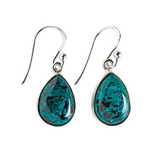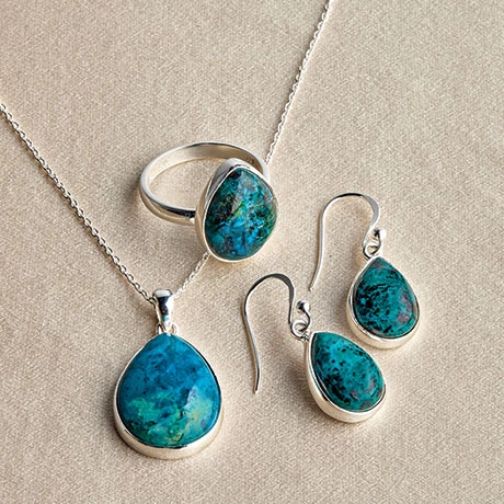Richly colored in blues and greens with a vitreous-like luster, a chrysocolla cabochon makes a dramatic focal piece. The classic teardrop shape of this gemstone is accentuated elegantly yet simply in a sterling silver setting. ⅝” x ¾”. Available in whole sizes 6-10. Imported.