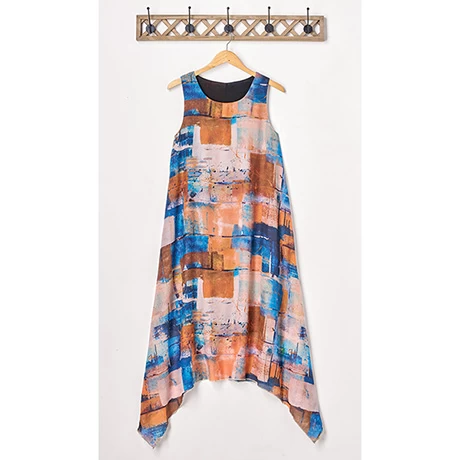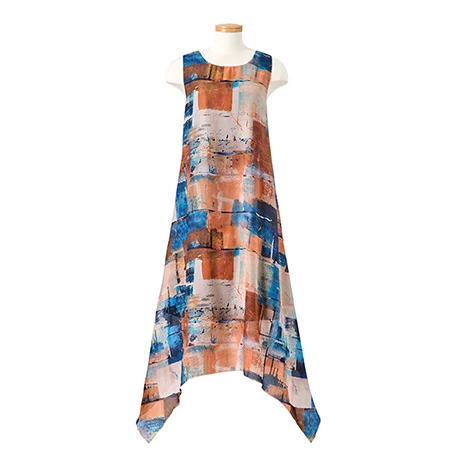 This lovely dress is so easy to wear, thanks to the pullover style and comfortable A-line cut. The silky overlay features a modern print in blues and oranges and the knit lining means it’s all you need, no slip required. The hem is longer on the sides, adding to the artsy glamour. Polyester. Hand wash. Imported. S(4-6), M(8-10), L(10-12), XL(14-16), 1X(18-20), 2X(20-22). M hangs 46″, longer on sides.