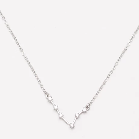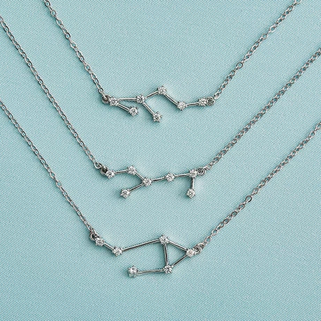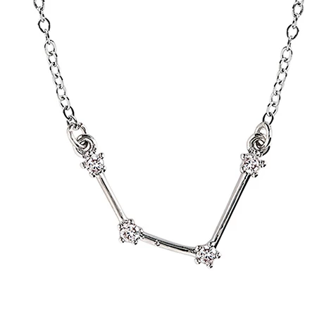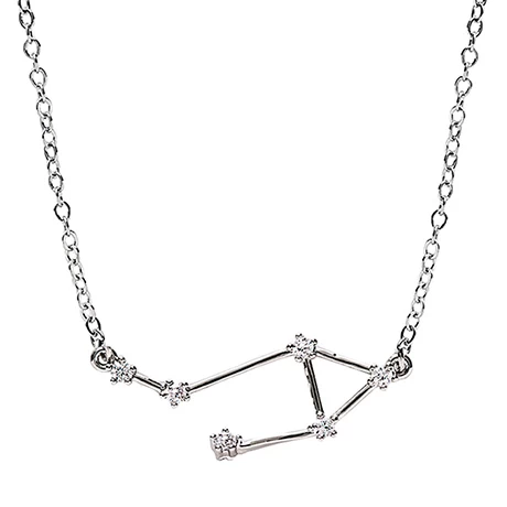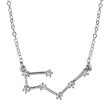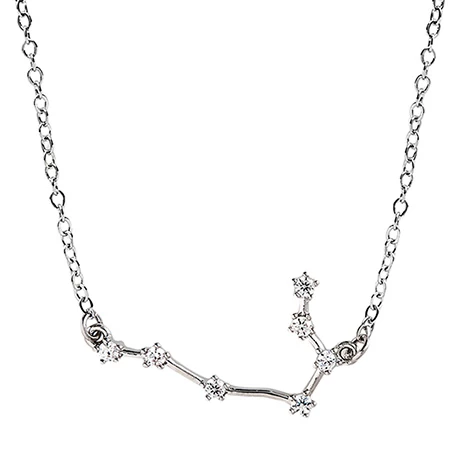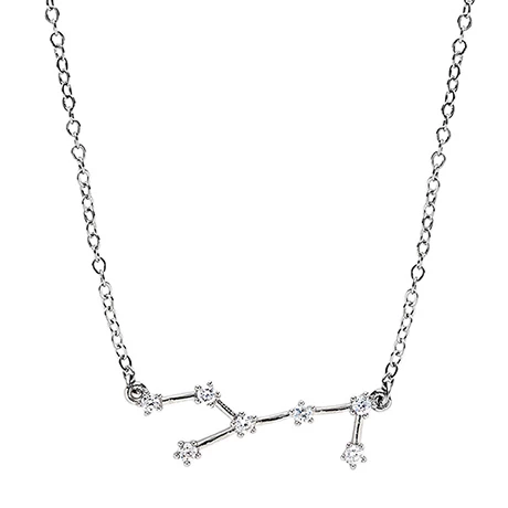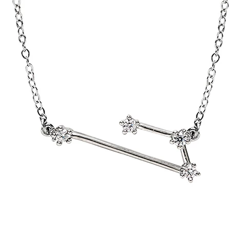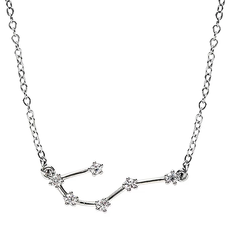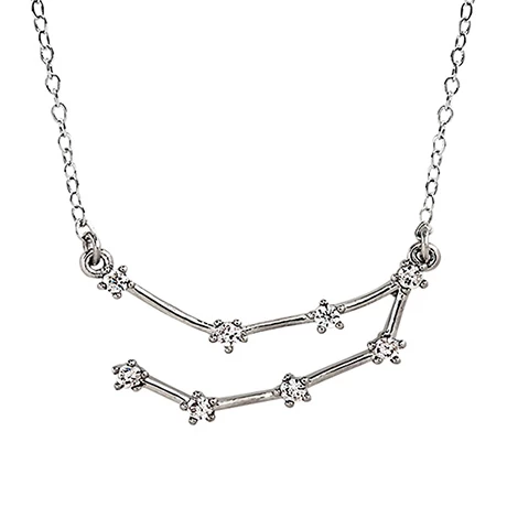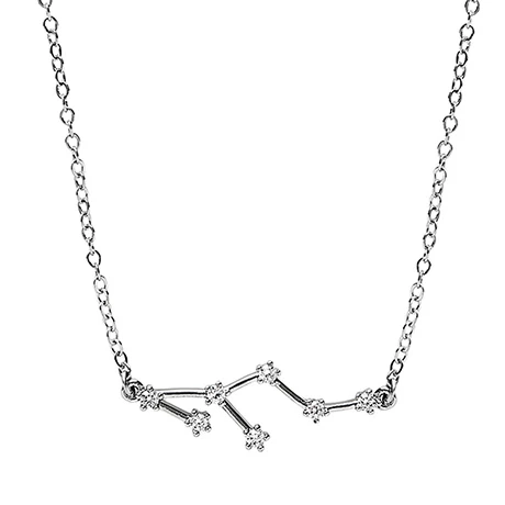 Inspired by stars in the sky, delicate sculptures trace your sign and rest gently on your neck. Each is made by hand from silver-plated brass and sparkling crystal rhinestones. 18″ necklace secures with a lobsterclaw clasp. Specify Aquarius, Pisces, Aries, Taurus, Gemini, Cancer, Leo, Virgo, Libra, Scorpio, Sagittarius, or Capricorn.