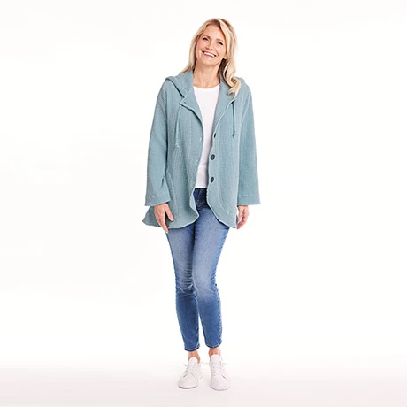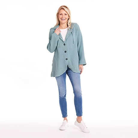 A versatile button-front jacket destined to become an everyday jacket: just heavy enough to wear outdoors on chilly days yet light enough for indoor wear or in a cold office. Pure cotton waffle weave, large buttons, on-seam pockets and a softly curved hem; the kind of details you’d find on a favorite sweater with timeless style. Generously sized. S(6-8), M(10-12), L(14-16), XL(16-18), 1X(18-20), 2X(20-22), 3X(22-24). Size M hangs 32″.