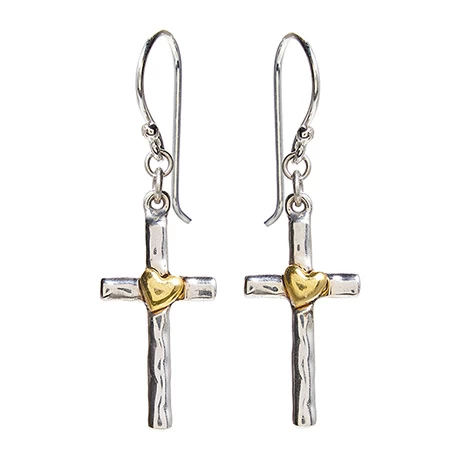 An artful expression of love and faith in simple but exquisite sterling silver earrings. With a delicate, organic feel, the crosses appear wonderfully fluid. A brass heart rests sweetly in their centers. The earrings are a memorable gift for a young girl celebrating confirmation or a caring and thoughtful gift to support a friend or family member in their beliefs. Earrings hang 1⠔.