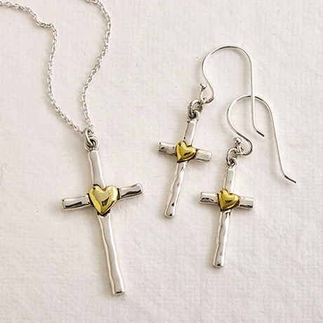 An artful expression of love and faith in a simple but exquisite sterling silver pendant. With a delicate, organic feel, the cross seems wonderfully fluid. A brass heart rests sweetly in the center. It’s a memorable gift for a young girl celebrating confirmation or a caring and thoughtful way to support a friend or family member in their beliefs. â…ť”w x 1â…ž”h. Sterling chain adjusts 16-20″.