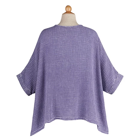 Fresh-as-a-daisy style in a highly textured, super-comfy, poncho-inspired top. Wear alone or over a tee. Pair with a skirt, jeans, or wide-legged flood pants. It’s guaranteed to look fabulous. Pure cotton. Lavender. Sizes S(6-8), M(10- 12), L(14-16), XL(16-18), 1X(18-20), 2X(20-22), 3X(22-24). Size M hangs 26″, longer on sides. Machine wash. Made in USA.