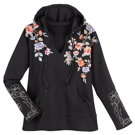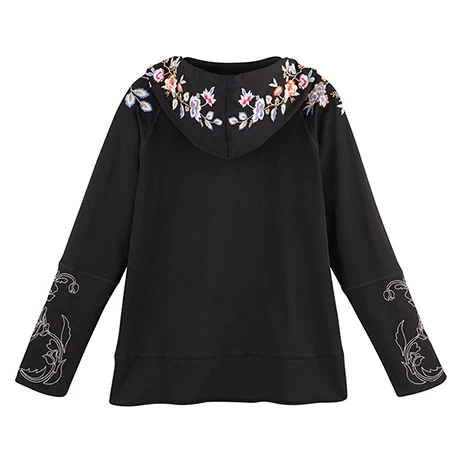 Sure, it’s technically a hoodie. But don’t let that fool you into thinking it’s just another sweatshirt. Just look at that beautiful embroidery that outlines the drawstring hood and runs across the shoulders and down the front. Not to mention the white stitching that decorates the raglan sleeves. Yet with all that going on, it hasn’t sacrificed any of the comfort features you’d expect, including a V neckline and kangaroo pocket. Cotton with hint of Spandex.. Raw edges. Sizes S(4-6), M(8-10), L(12-14), XL(14-16), 1X(18-20), 2X(20-22), 3X(22-24). M hangs 27″. Machine wash. Imported.