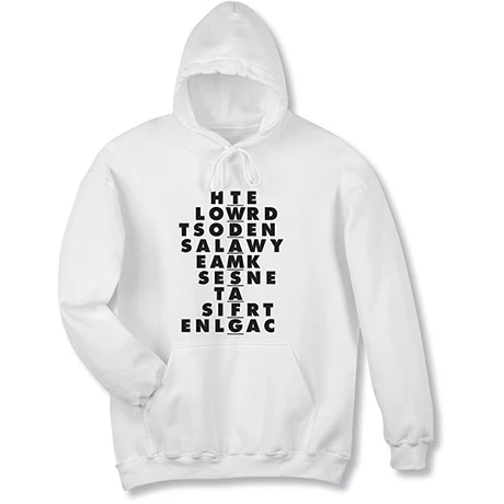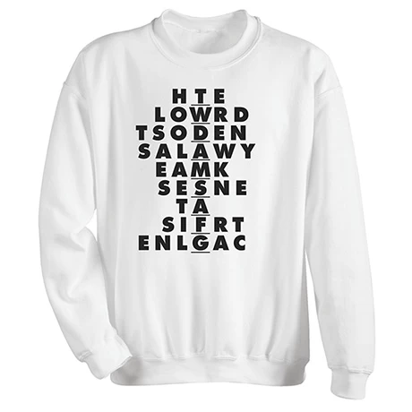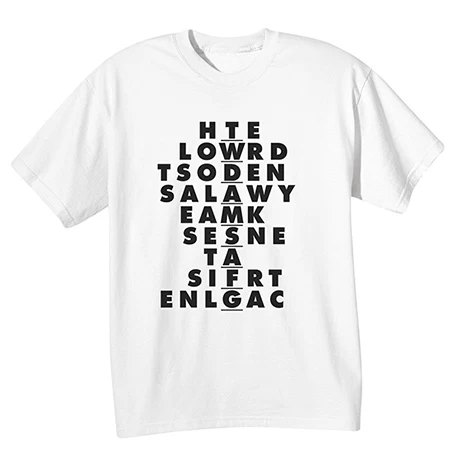When all you see is chaos … unscramble the words to find the hidden message. The underlined letter on each line is the first letter of that line’s word. “The world doesn’t always make sense at first glance.” White sweatshirt is 50/50 cotton blend, T-shirt is preshrunk 100% cotton. Sizes S-3XL. Imported.