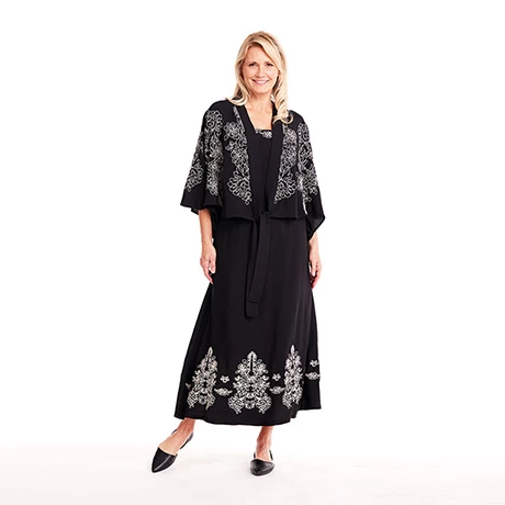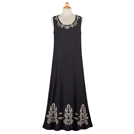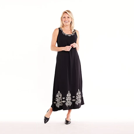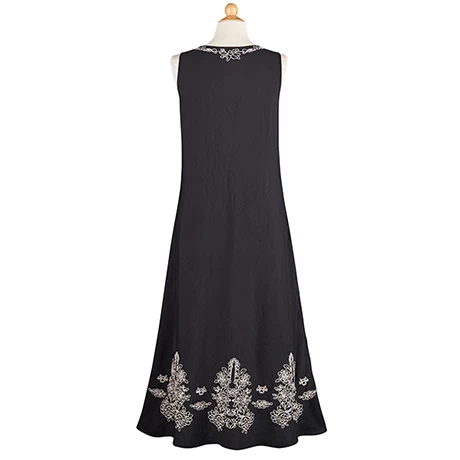 The little black dress, a wardrobe staple, gets a stylish upgrade with the flourishing touch of ivory embroidery on the front and back. Darts at the bustline give it a slightly fitted profile, while its pull-over design keeps it easy to slip on and go. Made of rayon viscose, it has a flattering and soft drape that will make you feel special every time you wear it. Machine wash. Imported. Sizes S(6-8), M(10-12), L(12-14), XL(14-16), 1X(18-20), 2X(20-22). M hangs 51″.