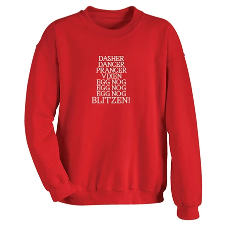 If you’d known the egg nog was spiked, you wouldn’t have indulged in three servings. Red sweatshirt is 50/50 cotton blend, T-shirt is preshrunk 100% cotton. Machine wash. Imported. S-3XL.