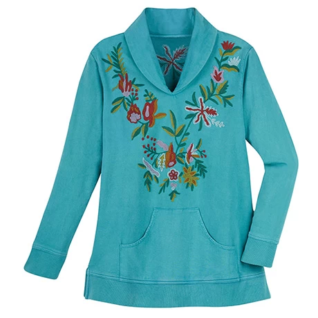 Got plans for the holidays? Make sure they include this gem of a sweatshirt. It’s loaded with details you’ll love to wear and show off: a shawl collar to keep your neck warm, 3″ side vents for a comfortable fit, accents of colorful crewel embroidery on the front and the back yoke. Choose from two jewel-toned shades. Pure cotton. Sizes S(6-8), M(10-12), L(14-16), XL(18), 1X(18-20), 2X(20-22), 3X(22-24). Size M hangs 37″. Hand wash. Imported. Specify Teal or Wine.