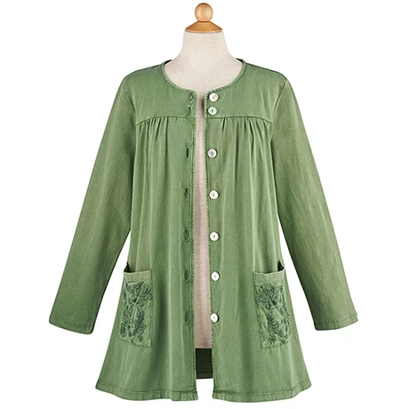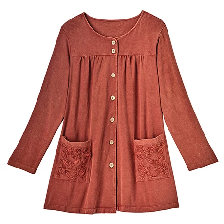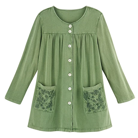 How can you improve on the classic smock design? Make it out of soft 100% cotton jersey knit in a lush shade and dress it up with a touch of embroidery. It’s a sweet top from April Cornell that’s as pretty as it is comfortable. Long sleeves. Shell buttons. Imported. S(4-6), M(8-10), L(12-14), XL(14-16), 1X(18-20), 2X(20-22), 3X(22-24). S hangs 31″. Specify Green or Terra Cotta.