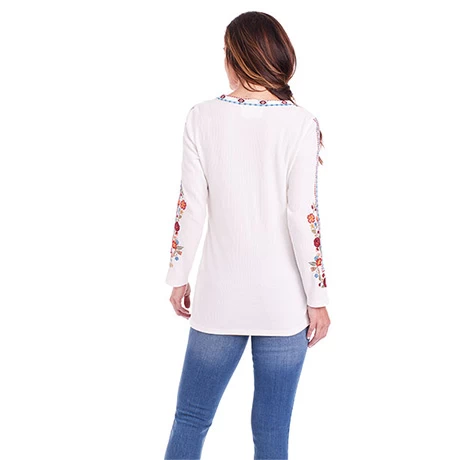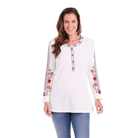 The laid-back thermal gets a makeover with embroidery down the sleeves and around the collar. Partial button placket. Poly/viscose/spandex. Machine wash. Imported. M-XL, 1X-3X.