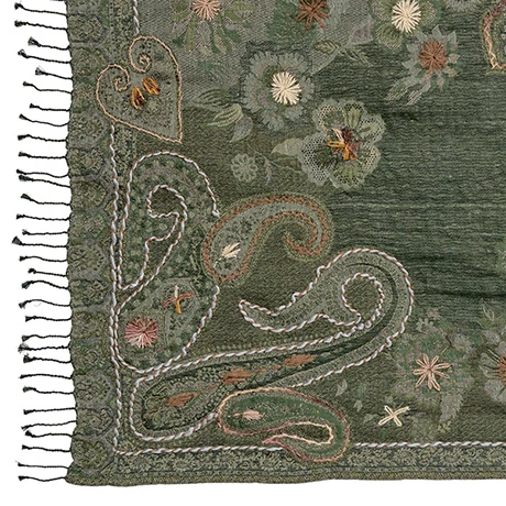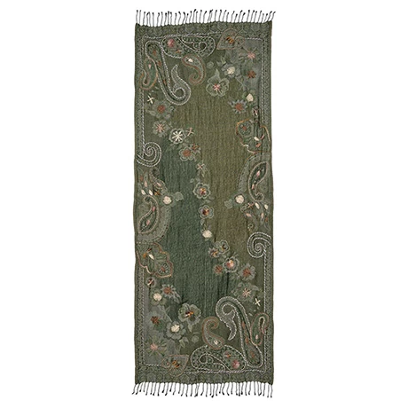 Woven in shades of green, hand-embroidered and finished with a knotted fringe, this wrap commands attention. The cozy wool-cotton blend takes the chill off. Gorgeous worn as a scarf over a winter coat. 27″ x 70″. Dry-clean. Made in India.