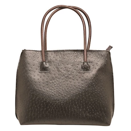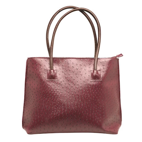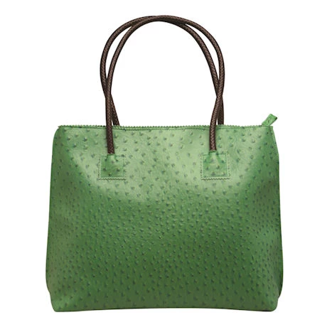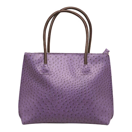 Oversized yet lightweight, durable yet soft, this roomy tote is the perfect way to tap into an elite trend in an animal-friendly, easy-care bag. Faux ostrich texture, dark brown braided handles and fully lined with two inner pockets. Zips close. PVC. Imported. 16″w x 14″h x 4″d with 9″ handle drop. Imported. Specify Purple, Red, Yellow, Blue, Burgundy, Green, or Black.