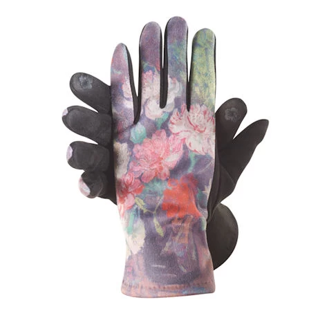 Stay warm, stay connected, and show your artistic side. Buttery-soft faux suede gloves have touch-screen technology (conductive fabric) on the thumbs and index fingers, so you’ll never miss a call or a text. Windproof, breathable poly-spandex, compatible with most devices. One size fits most. Hand wash. Imported. Specify Carnations, Irises, Starry Night, Sunflowersr by van Gogh, or Water Lilies by Monet.