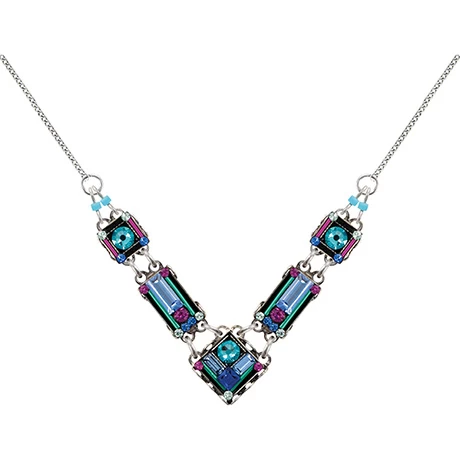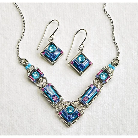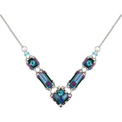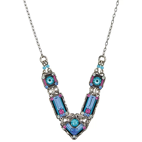 Austrian crystals, and delicate Czech glass beads combine in this striking mosaic cool-as-ice piece. Made by Firefly, a Guatemalan jewelry company known for its showstopping designs and color combinations, it’s a gem of an accessory with an heirloom-quality look about it that guarantees it will be treasured for years. Antique silverplated brass. Lobster claw clasp. Chain adjusts 16-18″. Also available coordinating Earrings HBN772.