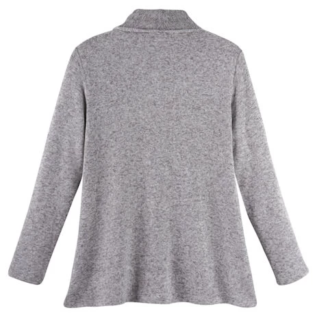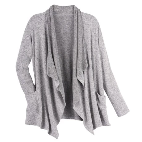 You’ll live in this, or wish you could. Marled knit fleece, this may be the softest, most comfortable piece you’ll ever own. Cardigan has a cascading open front, long sleeves, and patch pockets. Size M hangs 26″ in back, longer on front and sides. Sizes S(6-8), M(10-12), L(14-16), XL(16-18), 1X(18-20), 2X(20-22). Rayon-poly spandex blend. Machine wash. Imported. Specify Gray or Denim. Also available coordinating wide-leg pant (HAN722).