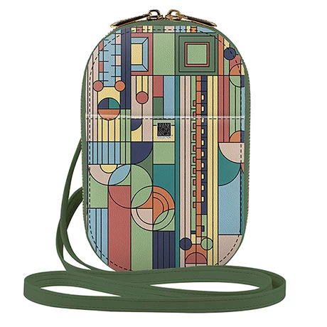 A reproduction of an iconic work of art from Frank Lloyd Wright creates a striking everyday accessory. The bag is big enough for work and petite enough for play, all while keeping your belongings close at hand and safe. On the inside, two full-length compartments and an ID or credit card pocket easily store a wallet, a largescreen cellphone, and other essentials. On the outside, front and rear pockets for easy access and a double-zipper feature. Adjustable strap. Made of quality, durable PU leather. 8″w x 5″h x 1½”d. Imported
