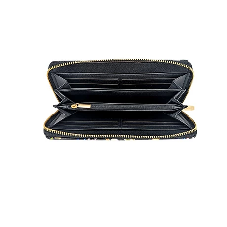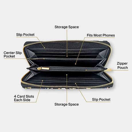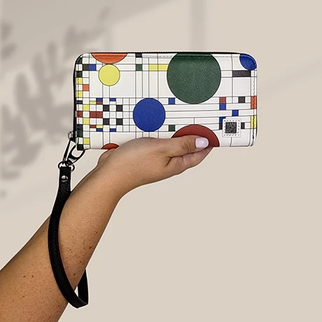 Flaunt one of Frank Lloyd Wright’s iconic designs on a textured, zip-around vegan leather wallet. Choose from Saguaro Sunrise based on the famous Arizona cacti or his 1912 Coonley Playhouse design with the famous Kinder-Symphony windows motif. It has 8 card slots and 7 storage compartments including a zip-close coin pouch. The full side-to-side zipper makes it easy to access everything. At 7.75”L x 4”H x 1”D. Removable wristlet strap. Imported.