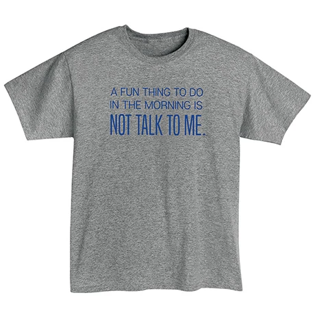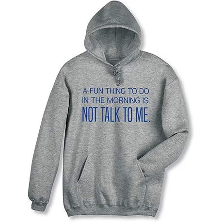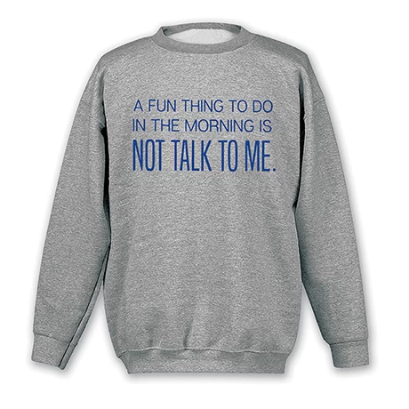 Not a morning person? No problem. Simply wear a do not-disturb warning everyone can understand. Sport gray sweatshirt is 50/50 cotton-poly blend, T-shirt is preshrunk 90/10 cotton-poly. Sizes S-3XL. Imported.