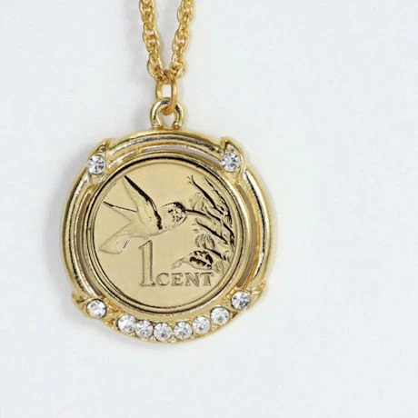Gold tone circle pendant features an authentic one-cent “hummingbird” coin from the Republic of Trinidad and Tobago lavishly layered with pure 24-kt. gold set in a gold tone and rhinestone bezel. The hummingbird’s delicate grace adds an elegance to this gold tone pendant hanging on a 24″ gold tone chain with a lobster claw clasp. Comes with a Certificate of Authenticity. Allow 1-2 weeks for delivery.