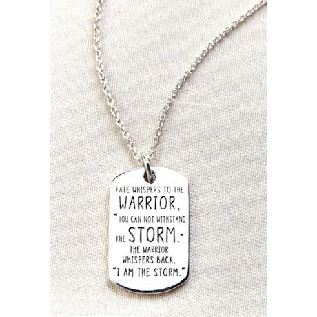 “Fate whispers to the warrior, ‘You cannot withstand the storm.’ The warrior whispers back, ‘I am the storm.'” Engraved with these powerful words, sterling silver pendant is a gift for the warrior you know, woman or man. 11/8″ pendant hangs from a sterling chain that adjusts 16-20″.