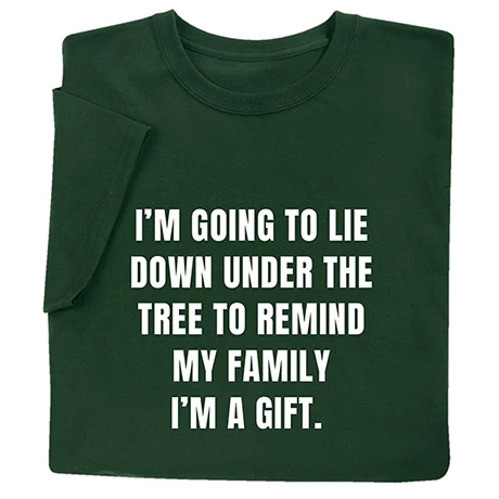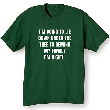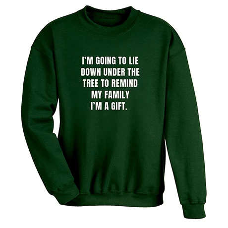 This offbeat holiday shirt is a perfect way to thank a family member or friend who went the extra mile this year, or always does. Dark green sweatshirt is 50/50 cotton blend, T-shirt is preshrunk 100% cotton. Sizes S-3XL. Imported.