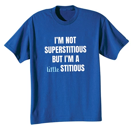 Being a “little” stitious means you’re not scared of black cats but you walk around them anyway. Royal blue sweatshirt is cotton/poly. T-shirt is preshrunk 100% cotton. Machine wash. Imported. S-3X.