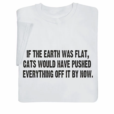 Exclusive! If the earth was flat, cats would have pushed everything off it by now. And they would have done it in the middle of the night, just to wake us up. White sweatshirt is 50/50 cotton blend, T-shirt is preshrunk 100% cotton. Sizes S-3XL. Imported.