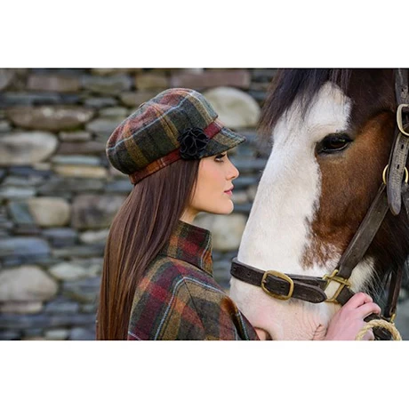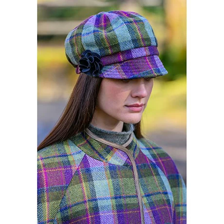 Made in Ireland using 100% wool, these ultra-breathable caps have a leather flower accent; beautiful craftsmanship and timeless design will make them your go-to finishing touch all season long. Dry clean. Fits most adult heads. Choose Hunter Plaid or Purple Plaid.