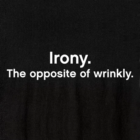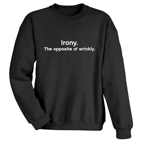 Exclusive! And you thought it had to do with sarcasm, Socrates, or a literary style or form. Black sweatshirt is 50/50 cotton blend; T-shirt is preshrunk 100% cotton. Sizes M-XXL. Imported.