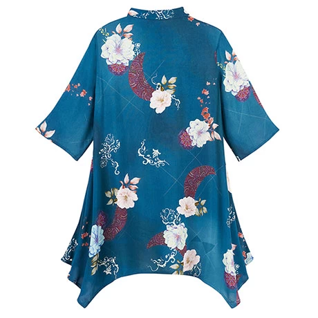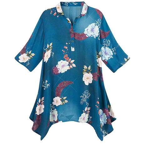 An Asian-inspired print with a luscious jade green background will have you reaching for this tunic time and time again. It flares at the sides adding the slightest touch of drama and interest. Four button placket in front, half sleeves. Sizes S(6-8), M(10-12), L(12-14), XL(14-16), 1X(18-20), 2X(20-22), 3X(22-24). Size M hangs 32″, longer on sides. Rayon viscose. Hand wash. Imported.