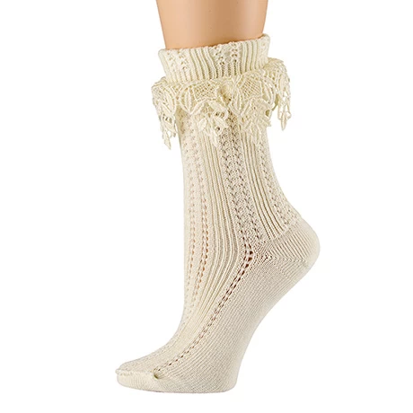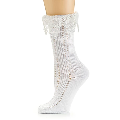 Innocent and dainty, beguiling and elegant. These are all words to describe these enchanting cream slouch socks decorated with lavish lace, chain stitching and columns of straight stiches. They’re extra comfortable in a cotton/spandex blend. Hand wash. Imported. One size fits most.