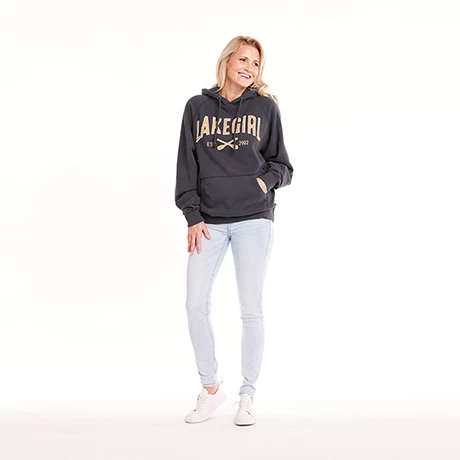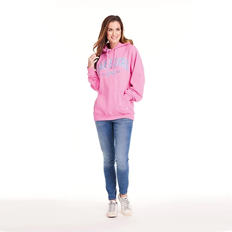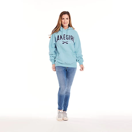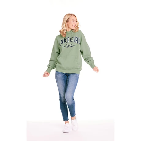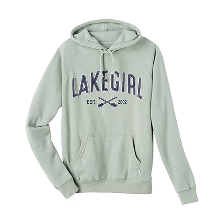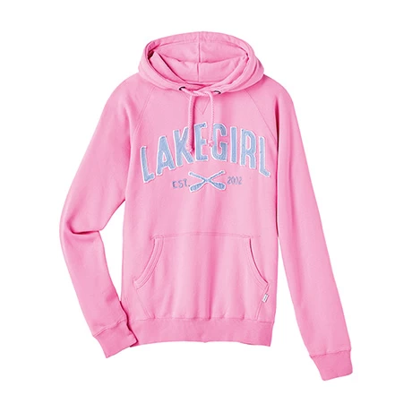A Lake Girl is a Lake Girl wherever she goes. She’ll wear this on the water, on the shore, and in her everyday life. Cozy sanded fleece sweatshirt is appliqued with “Lake Girl” and crossed oars. Drawstring hood, kangaroo pocket. Preshrunk cotton-poly blend. Relaxed fit, sizes S-XXL. Machine wash. Imported. Specify Aqua, Midnight, Pink or Sage.