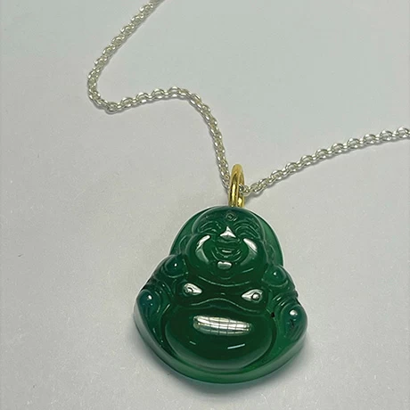 The Laughing Buddha is a popular symbol of good luck, happiness and contentment. This one is carved from a dyed green agate stone. 0.75″H. Sterling silver chain adjusts 16″-20″.